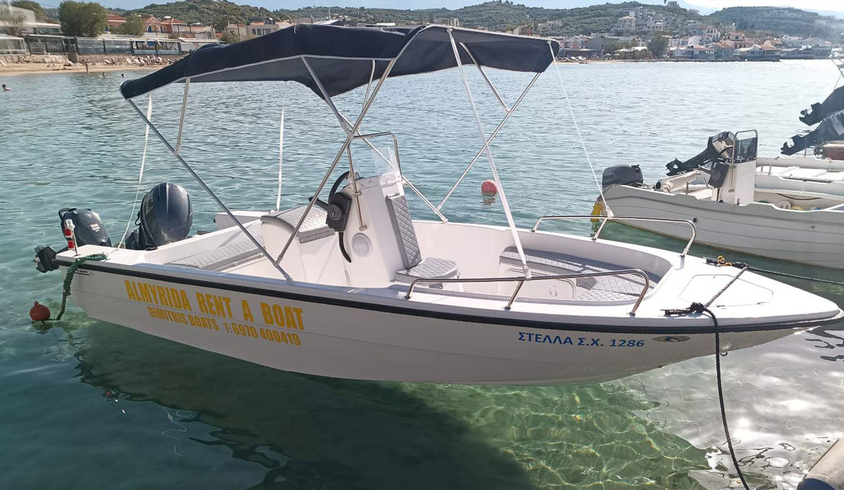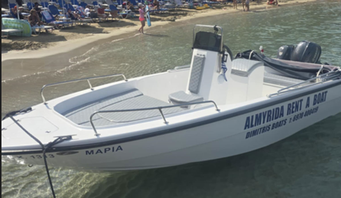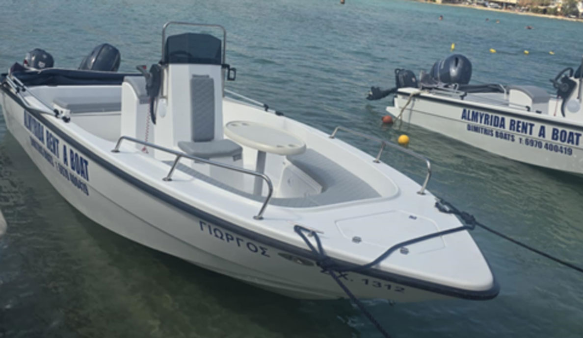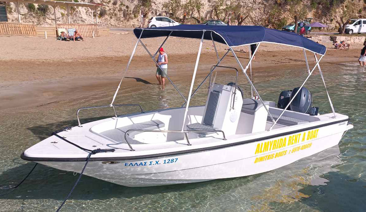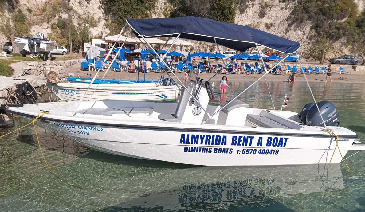 WE ARE HERE TO MAKE IT HAPPEN ENJOY THE SEA ABOUT US Dimitris Rent a BoatAs boatlovers our main goal is to offer you an unforgettable day on sea. We want you to go home with a marvellous memory of Cretan sea.We offer you the opportunity to live unique experiences on sea with access to magical places.Our boats are equipped with maximum comfort and they meet all safety requirements. We have boats without a license.Feel free to take a look at our current range of boats or if you prefer to visit us personally, we love to welcome you in the Almyrida marina..Discover the magic of the Area….… For Your Reservation Call +30 6970 400 419 & 6940 848 737 OUR BOATS STELLA 5.5 meter . deck boat30 HP 4-Stroke Yamaha outboard engine.2nd emergency auxiliary. 4 hpUSB socketPower socket like the carShowerCooler Bowrider layout, ample seatingFront and rear anchors, lines, fenders,boat hook and ladder.Tank for 60 liters of fuelCapacity: 7 adultsAll equipment required by coast guard is on the boat. HELLAS 5.5 meter . deck boat30 HP 4-Stroke Yamaha outboard engine.2nd emergency auxiliary. 4 hpUSB socketPower socket like the carShowerCooler Bowrider layout, ample seatingFront and rear anchors, lines, fenders,boat hook and ladder.Tank for 60 liters of fuelCapacity: 7 adultsAll equipment required by coast guard is on the boat. CAPTAIN MaLINOS 5.5 meter . deck boat40 HP 4-Stroke Yamaha outboard engine.2nd emergency auxiliary. 4 hpUSB socketPower socket like the carShowerCooler Bowrider layout, ample seatingFront and rear anchors, lines, fenders,boat hook and ladder.Tank for 60 liters of fuelCapacity: 7 adultsAll equipment required by coast guard is on the boat. GIORGOS 5.5 meter . deck boat30 HP 4-Stroke Yamaha outboard engine.2nd emergency auxiliary. 4 hpUSB socketPower socket like the carShowerCooler Bowrider layout, ample seatingFront and rear anchors, lines, fenders,boat hook and ladder.Tank for 60 liters of fuelCapacity: 7 adultsAll equipment required by coast guard is on the boat. MARIA 5.5 meter . deck boat30 HP 4-Stroke Yamaha outboard engine.2nd emergency auxiliary. 4 hpUSB socketPower socket like the carShowerCooler Bowrider layout, ample seatingFront and rear anchors, lines, fenders,boat hook and ladder.Tank for 60 liters of fuelCapacity: 7 adultsAll equipment required by coast guard is on the boat. Αννα 5.5 meter . deck boat80 HP 4-Stroke Yamaha outboard engine.2nd emergency auxiliary. 4 hpUSB socketPower socket like the carShowerCooler Bowrider layout, ample seatingFront and rear anchors, lines, fenders,boat hook and ladder.Tank for 60 liters of fuelCapacity: 7 adultsAll equipment required by coast guard is on the boat. Fill the form for your booking Contact Form Demo (#3)ΔFirst NameLast NameEmailMobile NumberPersons on Boat one two three four fiveRent a Boat Choices Two (2) hours Four (4) hours Eight (8) hoursPreferred Day Monday Tuesday Wednesday Thursday Friday Saturday SundayYour MessageSend your Message PLACES TO VISIT Omprogialos Beautiful clean waters. For those who like steep, rocky. It’s not for little kids, there’s no beach. Finikias On Finikias hill, right above the Basilica site, are the ruins of a Greek-Roman city. Seitan Limania The beach is amazing! Soft sand and beautiful blue waters! Plus lots of goats trying to be your friend! Marathi Marathi is a beautiful, clean shore in Souda Bay. It’s a really popular destination because of its lovely natural beauty and exotic atmosphere Koutalas Koutalas Beach and sea cave in Crete are a bit secluded but definitely worth the effort. The sea cave accents the beautiful blue of the sea. Petrovitsa A beautiful small bay accessible only by boat and deep blue waters, ideal for experienced divers looking for deep diving and wall diving. NAVIGATION MAP Almyrida - Our village Dimitris Tavern in Almyrida